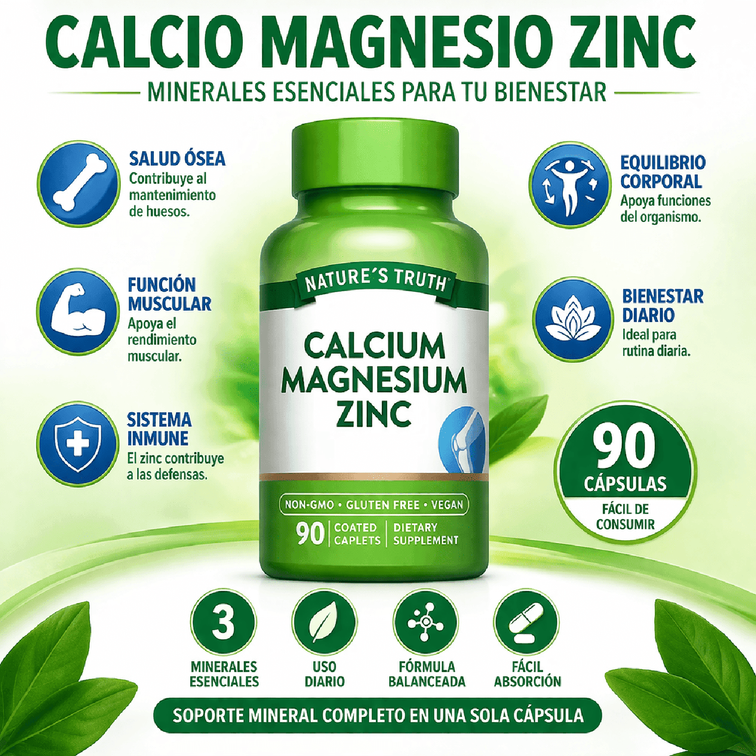 Calcio Magnesio Zinc en cápsulas es una fórmula mineral completa diseñada para apoyar el bienestar diario. Combina tres minerales esenciales que contribuyen al funcionamiento adecuado del organismo y ayudan a mantener un estilo de vida activo.