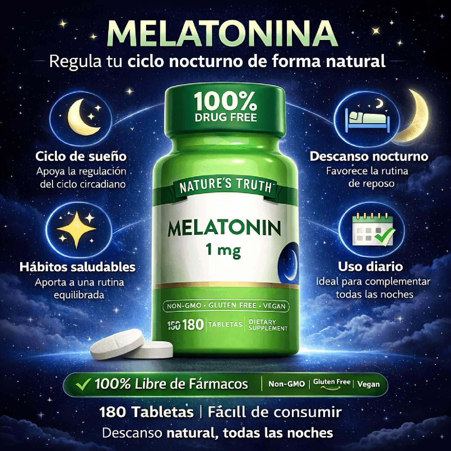 Melatonina 1 mg en tabletas es un suplemento diseñado para complementar la rutina nocturna. Su formato práctico permite un consumo sencillo y constante, ideal para quienes buscan incorporar hábitos de descanso más organizados.