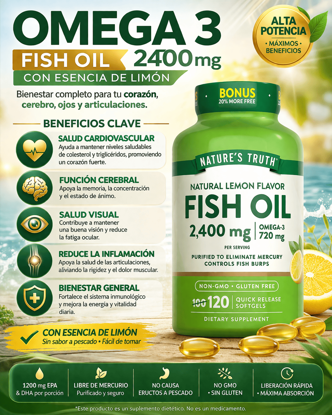 Omega 3 Fish Oil 2400 mg con Esencia de Limón – Cápsulas Blandas